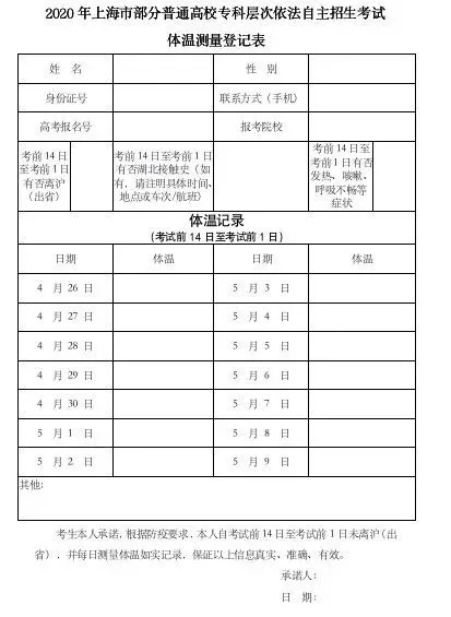 根据上海市教委的文件精神,各位考生必须从4月26日起到5月9日,每日认真测量体温并如实填入《2020年上海市部分普通高校专科层次依法自主招生考试体温测量登记表》。