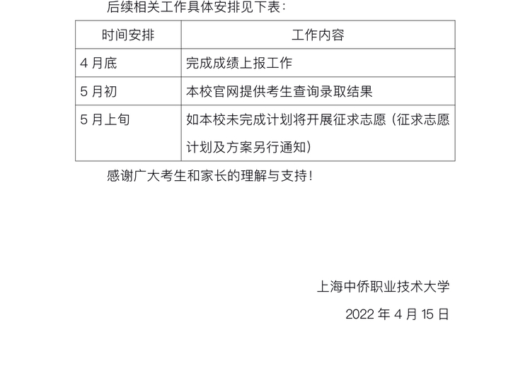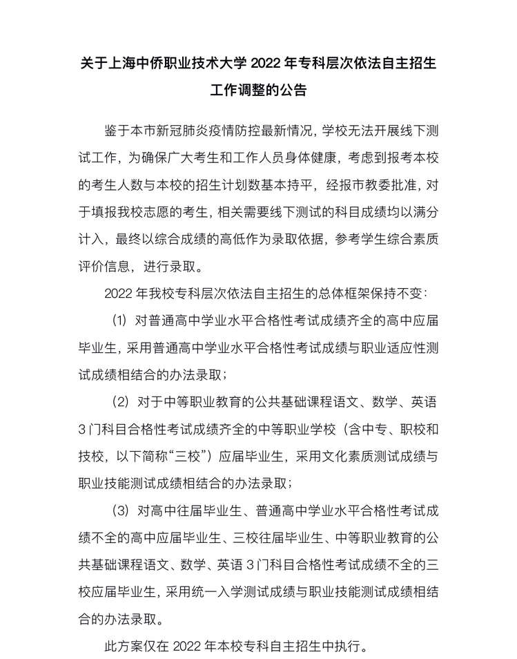 关于上海中侨职业技术大学2022年专科层次依法自主招生工作调整的公告