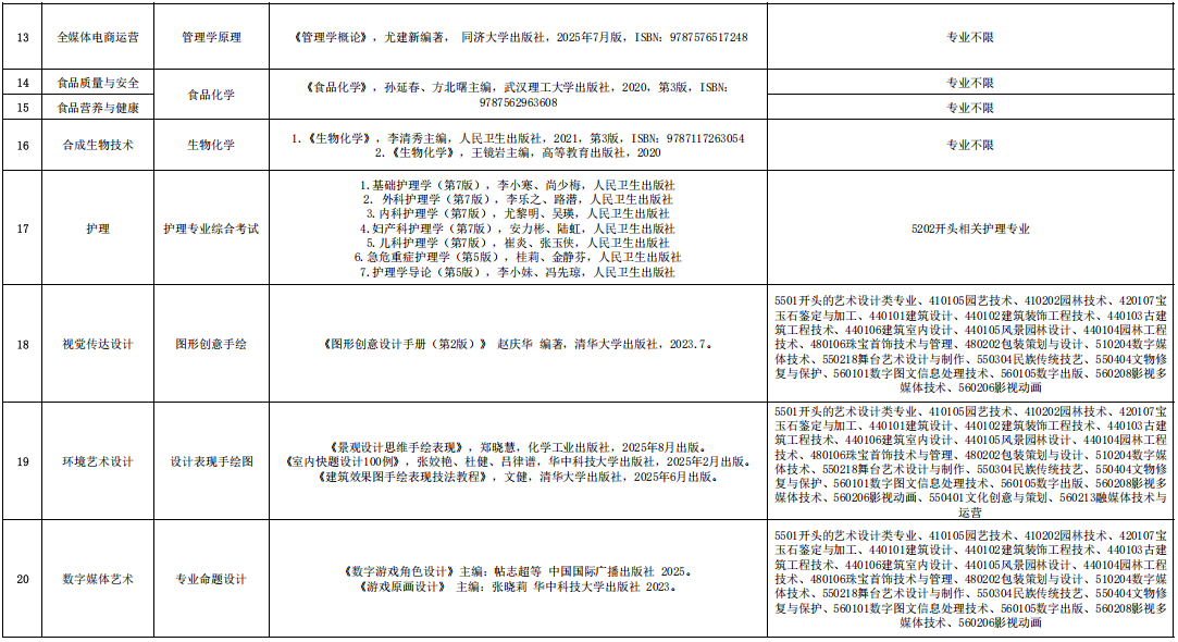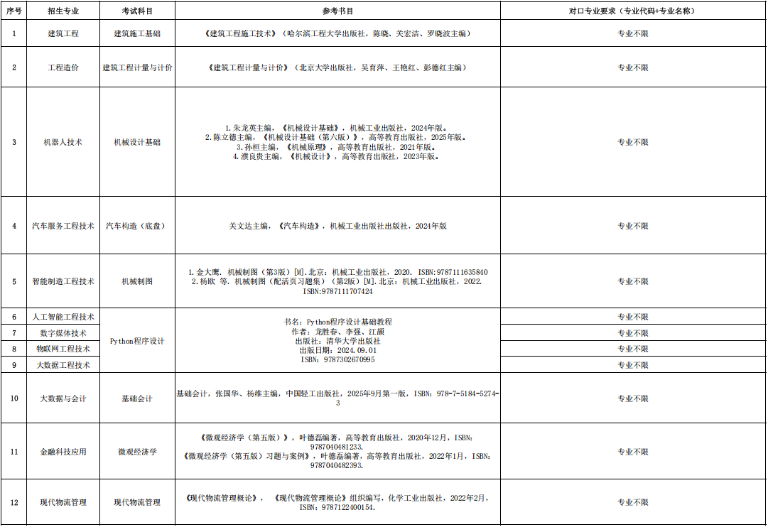 “专升本”拟招生专业、考试科目及对口要求一览表